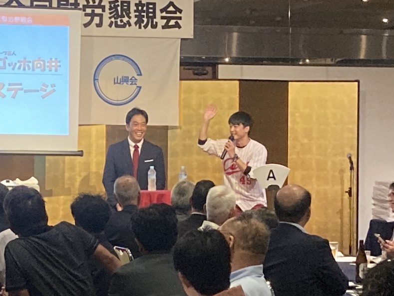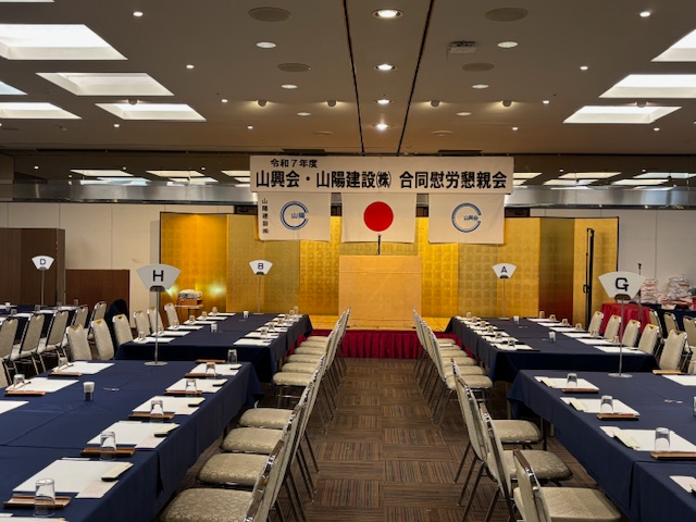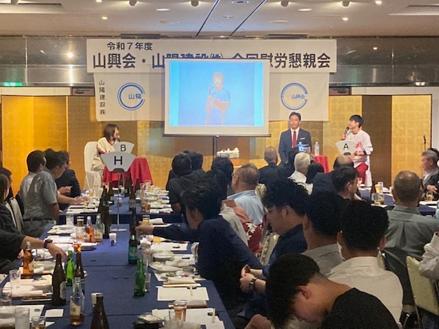 山興会・山陽建設さんの合同慰労懇親会で150人くらいの方々と一緒にワイワイと。