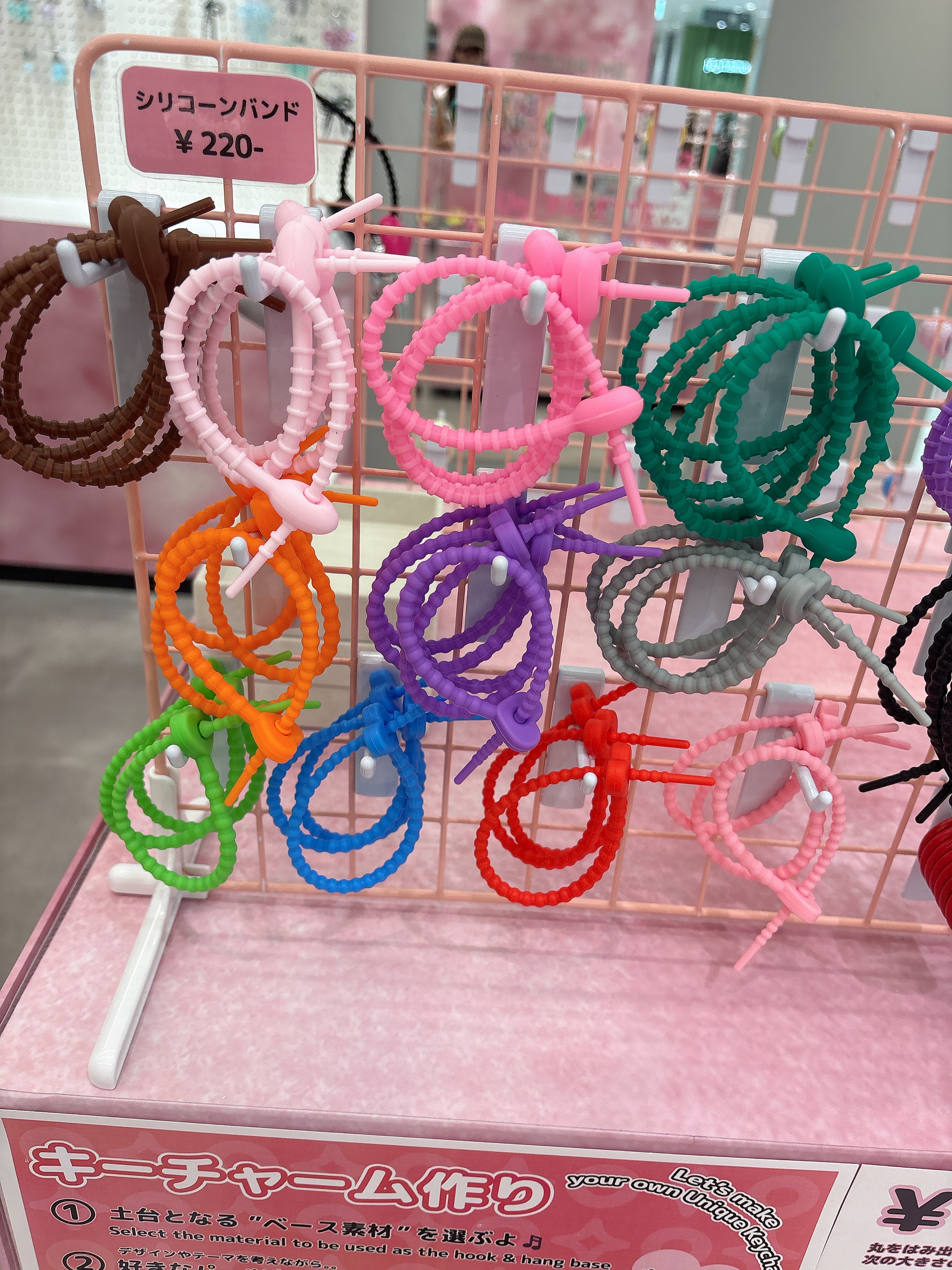 まずは、パーツを付ける土台となる部分を選びます。キーリングやストラップなどいろいろあるのですが、私は使いやすさ重視でシリコンバンドに決めました。