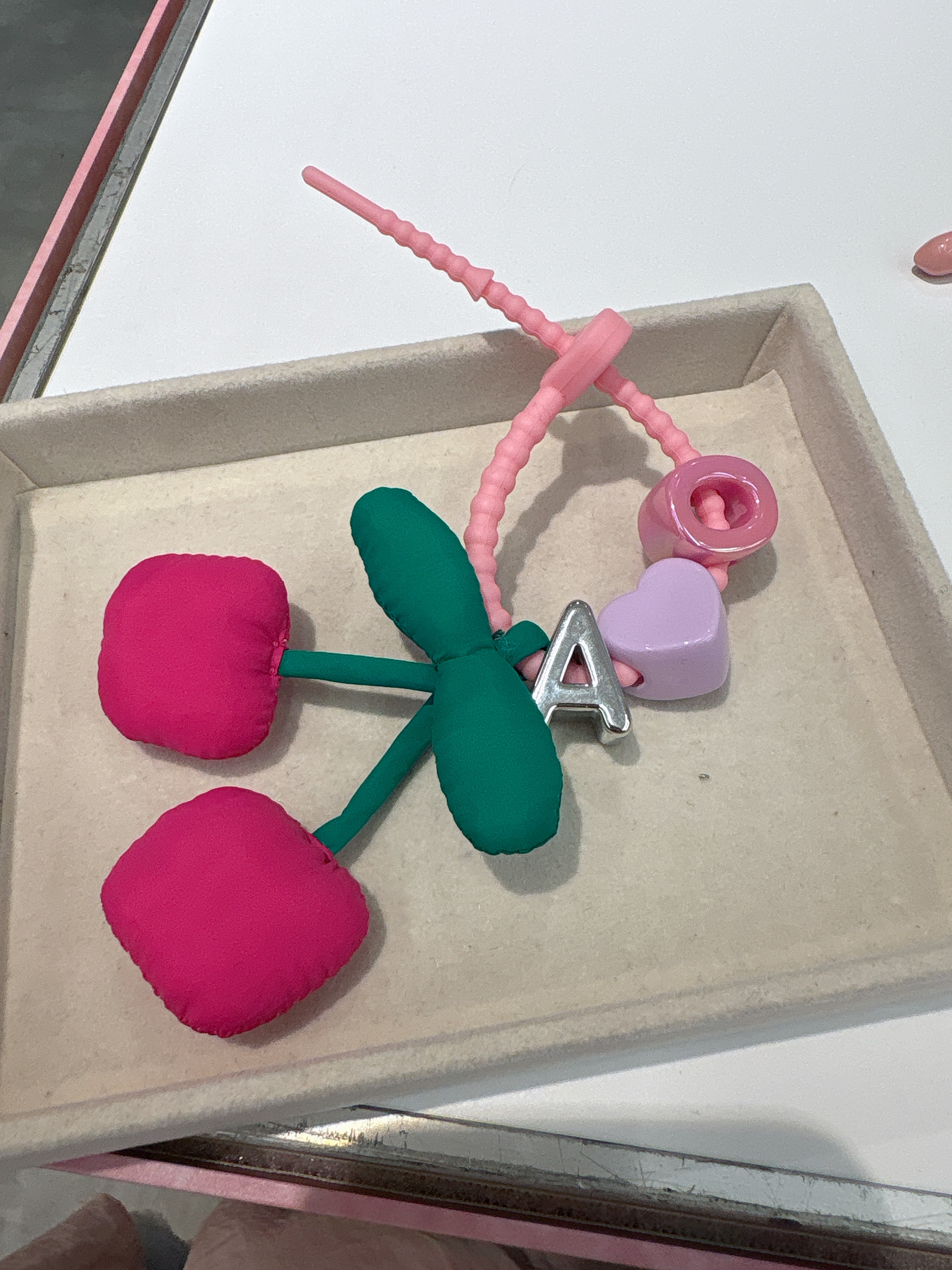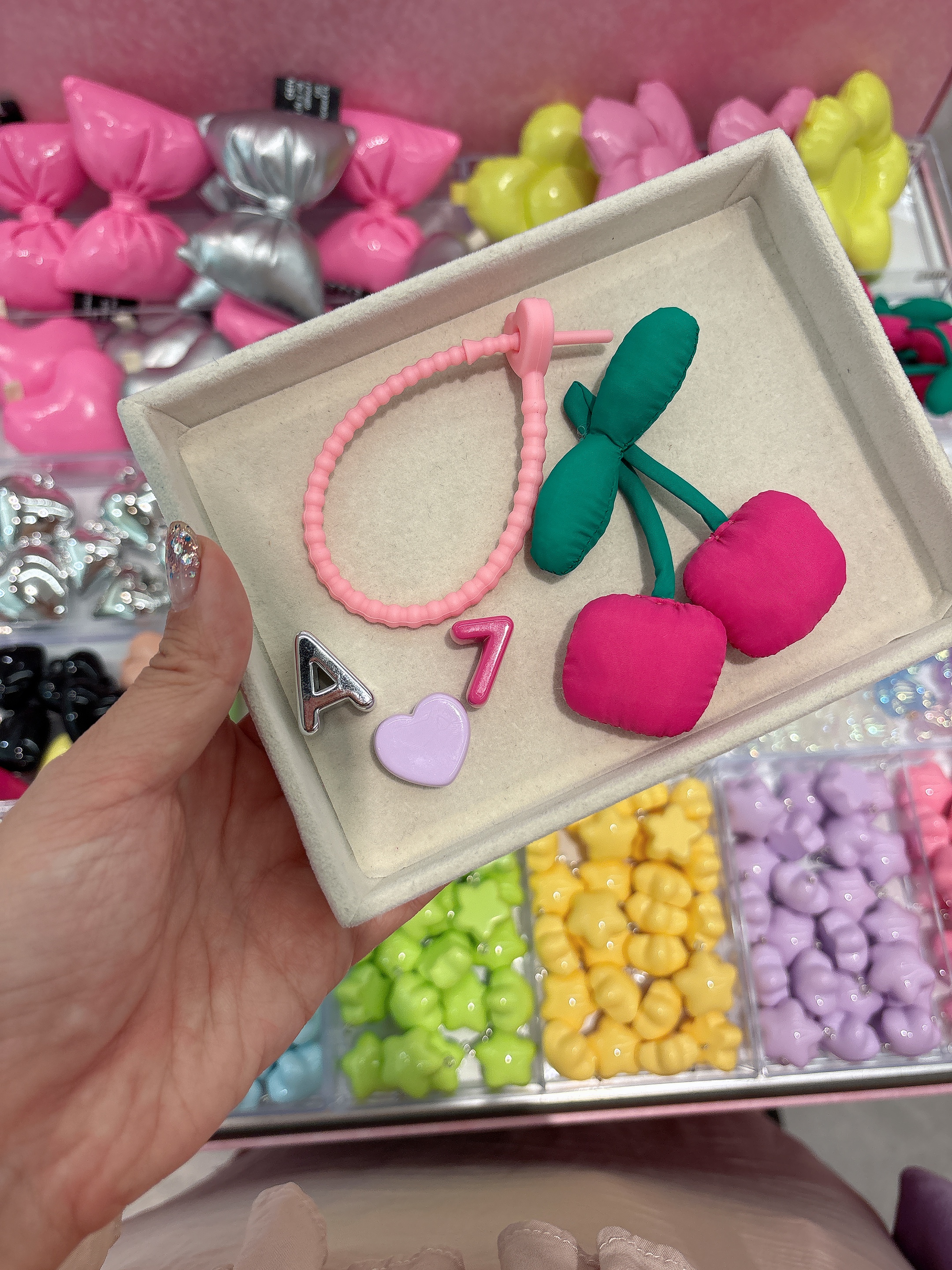 パーツは1個220円のアルファベットとハートを選びました。これだけだと寂しかったので、大きなサクランボをドーン。この組み合わせで本当にいいのだろうか・・・と迷っていたところ、スタッフさんが「一度作ってみてから購入することもできますよ~」と案内してくれました。