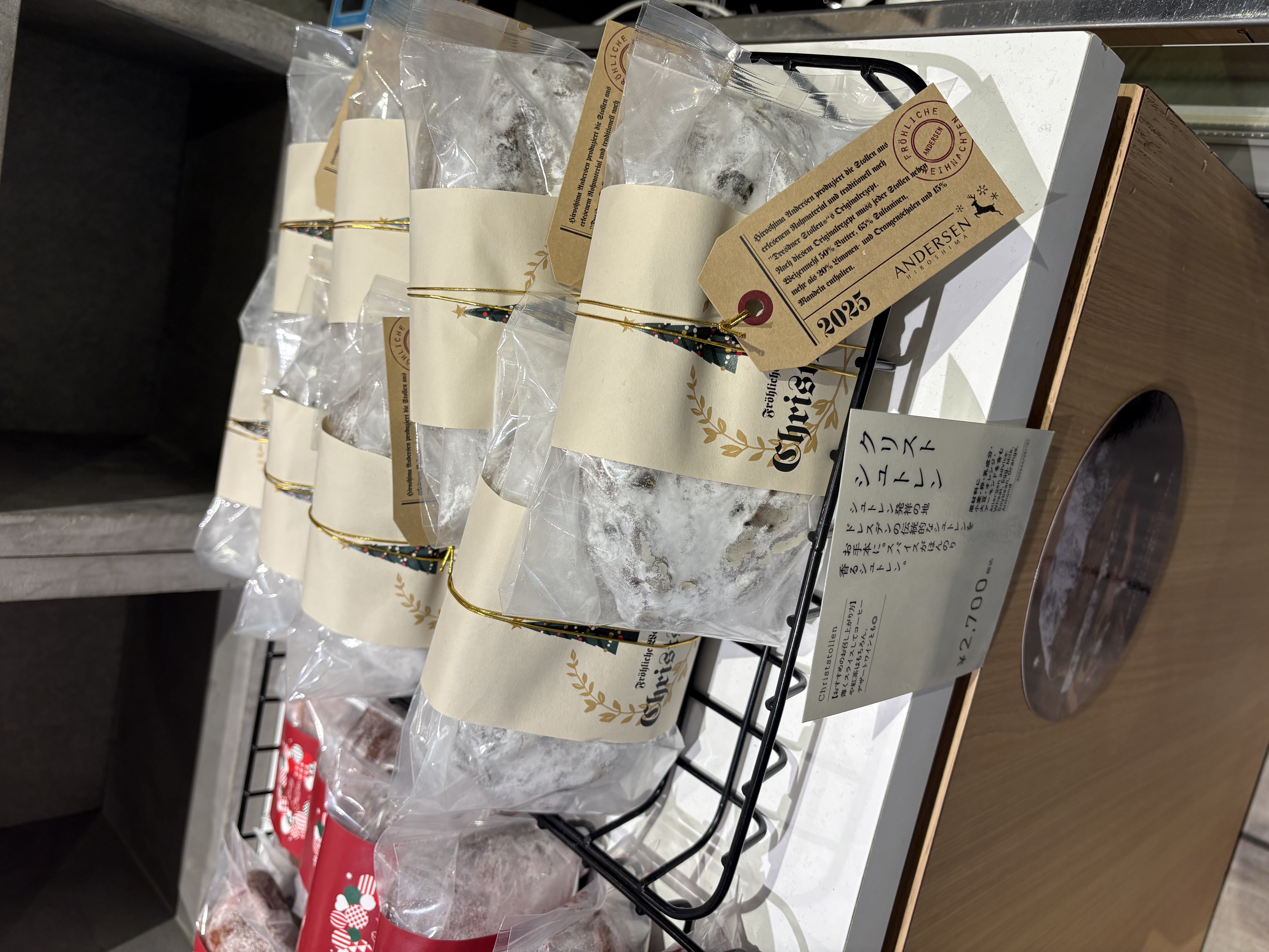 期間限定のクリスマスビールも発見しましたよ~。アンデルセンファームのリンゴを使ったクラフトビールとのことで、気になります。パッケージも可愛らしいので、クリスマスの食卓に並べたいな~。もちろん、クリスマスといえば・・・の、シュトレンも今ならたくさん並んでいます。