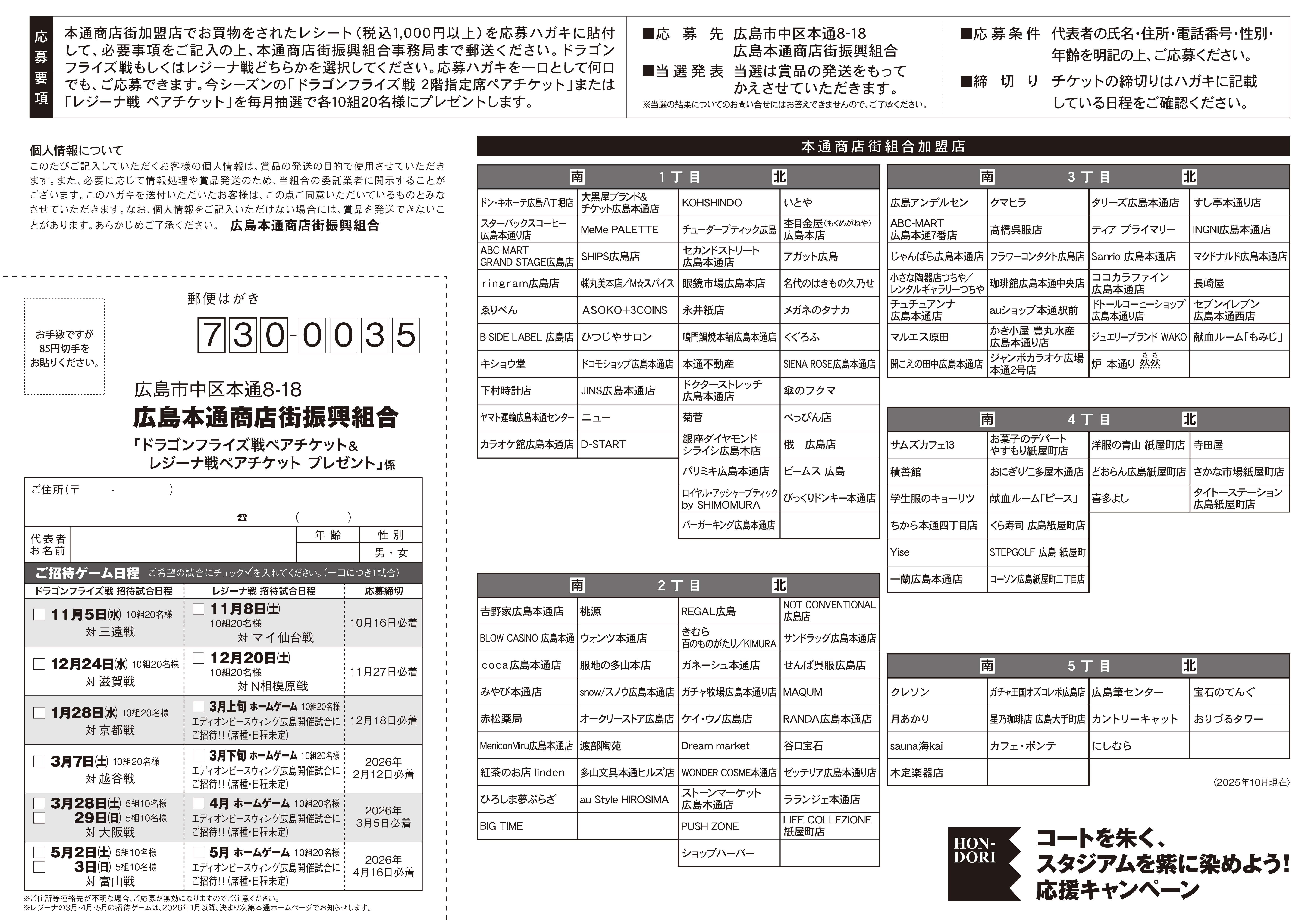 本通商店街加盟店でお買物をされたレシート(税込1, 0 0 0円以上、2025年10月以降のレシートが有効です)を応募ハガキに貼付して、必要事項をご記入の上、本通商店街振興組合事務局まで郵送ください。