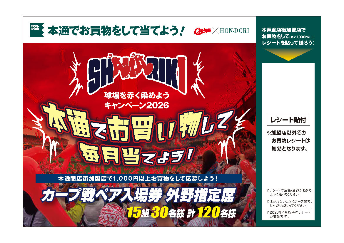 本通商店街加盟店でお買物をされたレシート(税込1, 0 0 0円以上)を応募ハガキに貼付して、必要事項をご記入の上、本通商店街振興組合事務局まで郵送ください。