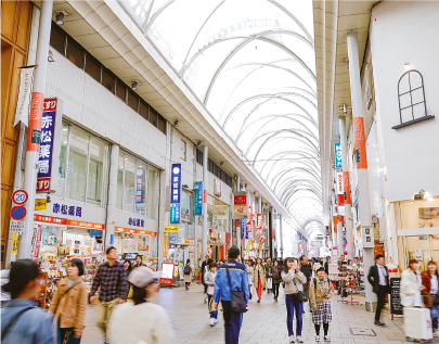 また、本通の最も西側に位置する本通5丁目(グリーンゾーン)は、米などの穀物や中国の器など舶来品の唐物などを扱う商人が多く住んでいた旧町名「細工町」と大手町の一部に当たります。現在は、雑貨店や飲食店、洋品店などバラエティーに富んだ店が集まっています。若者向けのファッションビル『サンモール』も、商店街の盛り上げの一端を担っています。