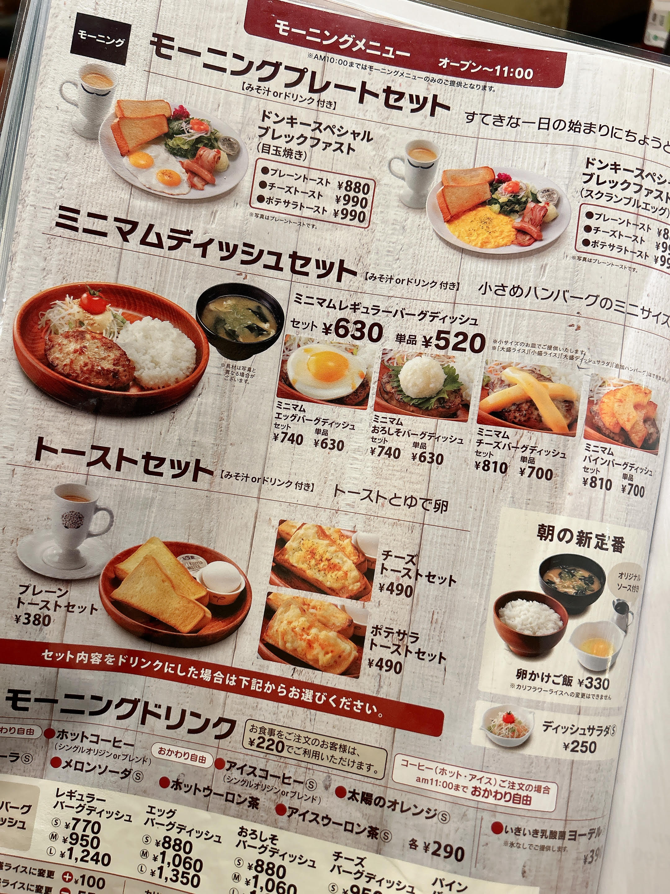 モーニングプレートやトーストセット、卵かけご飯もありますが、私のイチオシはミニマムディッシュセットです。やっぱり『びっくりドンキー』といえば、ハンバーグ!