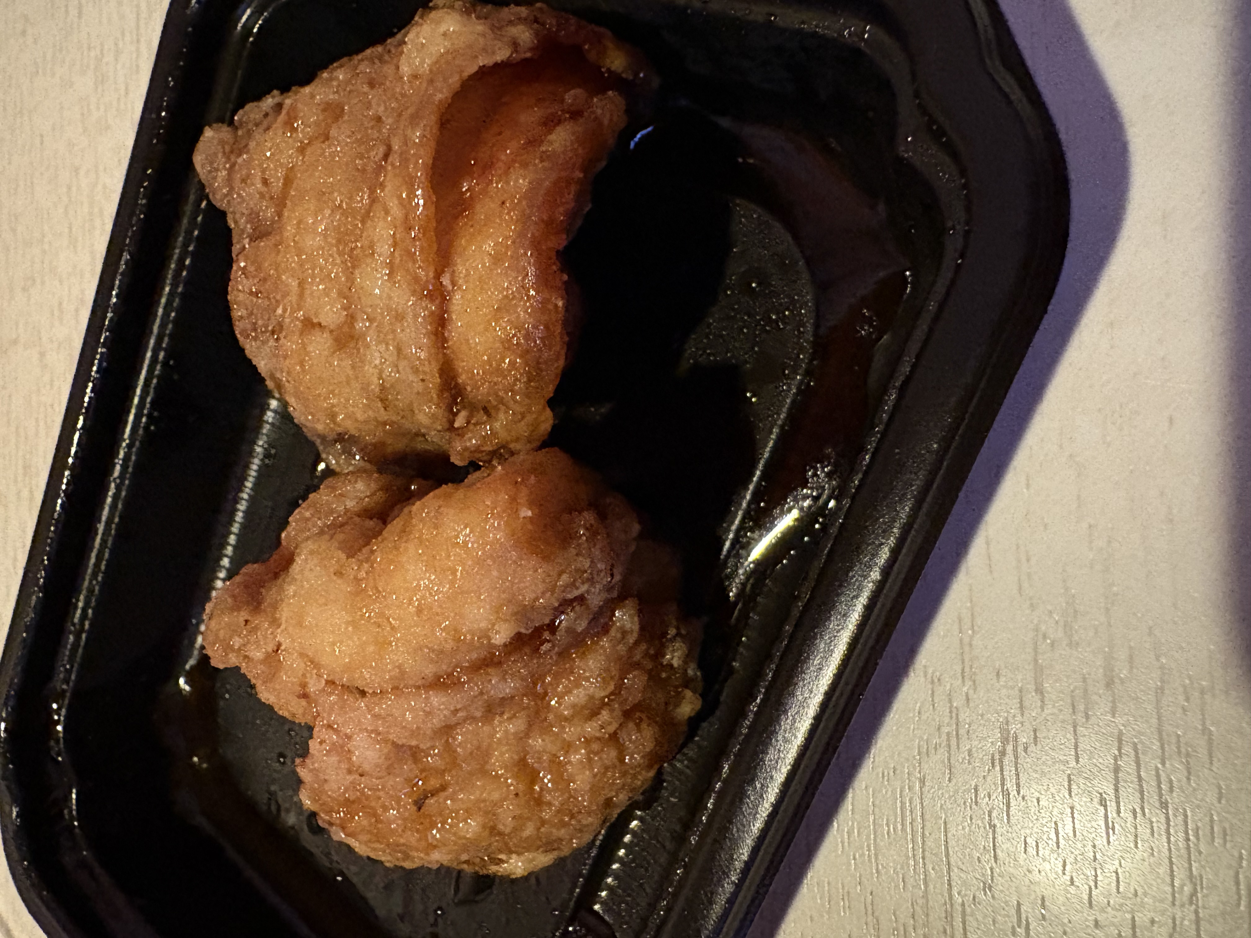 私がこの日選んだのは、明太マヨポークたまご(410円)&大葉と梅みその玄米むすび(205円)。香味だれの唐揚げ(1個183円)も2つ追加しました。おにぎりは食べ応えが満点で、1個でも満足度が高い! 唐揚げもたれがよく絡んでいてご飯によく合います。次は豚汁を注文したいな~。