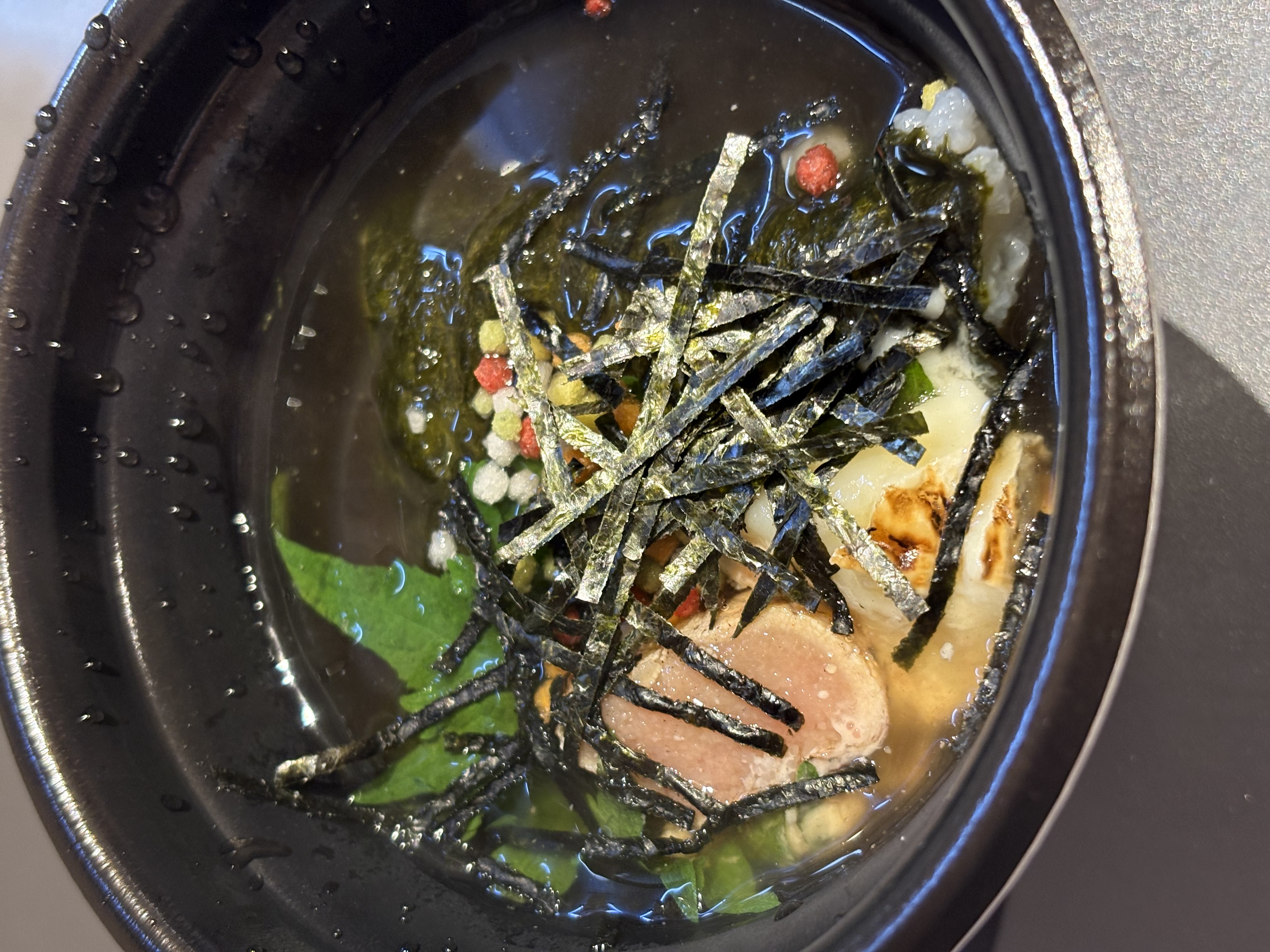 1つで十分食べ応えがある、まさに〝ごちそうおむすび〟。半分ほど食べて、残りはイートイン限定で楽しめる出汁茶漬けにして楽しみました~。